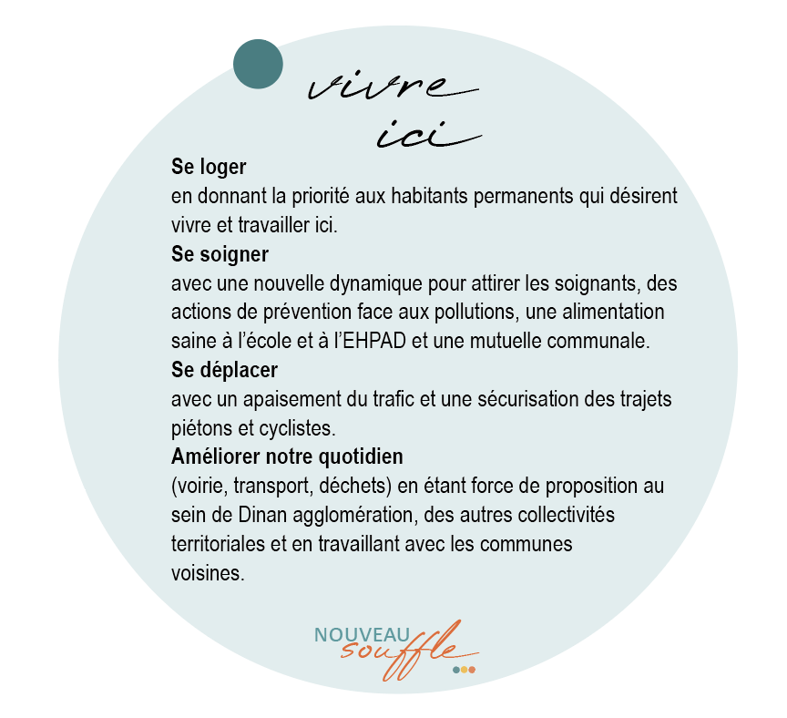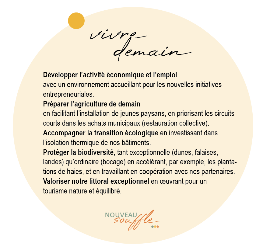 Nous voulons vivre ensemble, ici, dans le respect de toutes et tous, sur un territoire convivial, solidaire et dynamique. Notre ambition pour demain est donc de construire, avec vous, une commune attractive, solidaire et respectueuse de son environnement. Une commune qui puise dans son passé les atouts pour construire son avenir à court et long terme. Nous souhaitons développer la vie locale, le loge ment et l’emploi, tout en prenant en compte l’histoire de Fréhel, ses paysages et les conditions de vie de ses habitants. Unis par la passion de notre littoral sauvage, animés par l’envie de développer du lien social de proximité et convaincus qu’il faut agir dans la transparence, nous nous engageons à rester authentiques et accessibles dans l’aventure citoyenne qui nous attend tous.