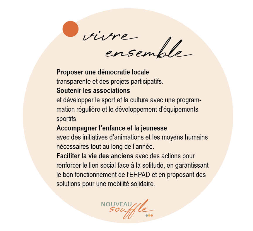 Nos compétences en gestion d’équipe, administrative et financière, animation, communication, engagement politique et associatif à différentes échelles vous garantissent la gestion rigoureuse et fiable de notre commune et, surtout, un projet de vie à long terme sur notre territoire.